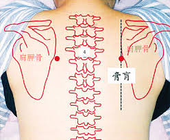 整体の先生は、身体のどこかしら悪いものがあると必ず肩甲骨の.内側、上の図の膏肓というツボの辺りにかたーいコリが隠れている、と言います。